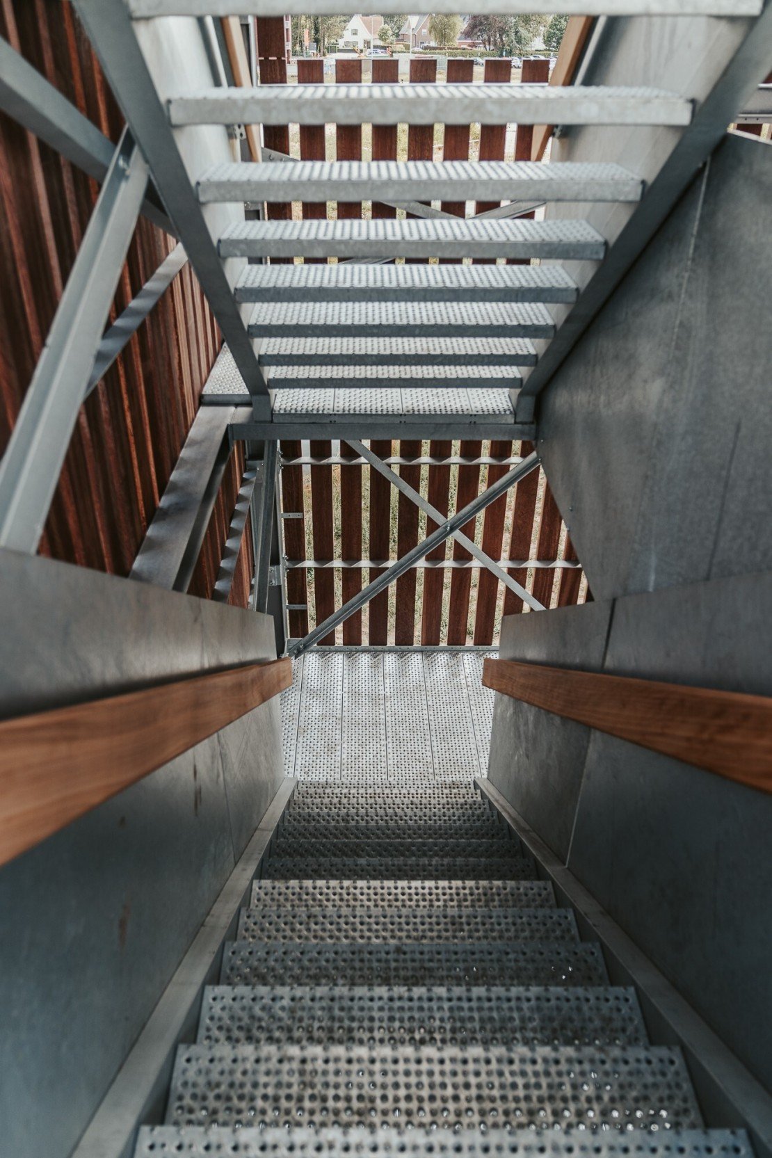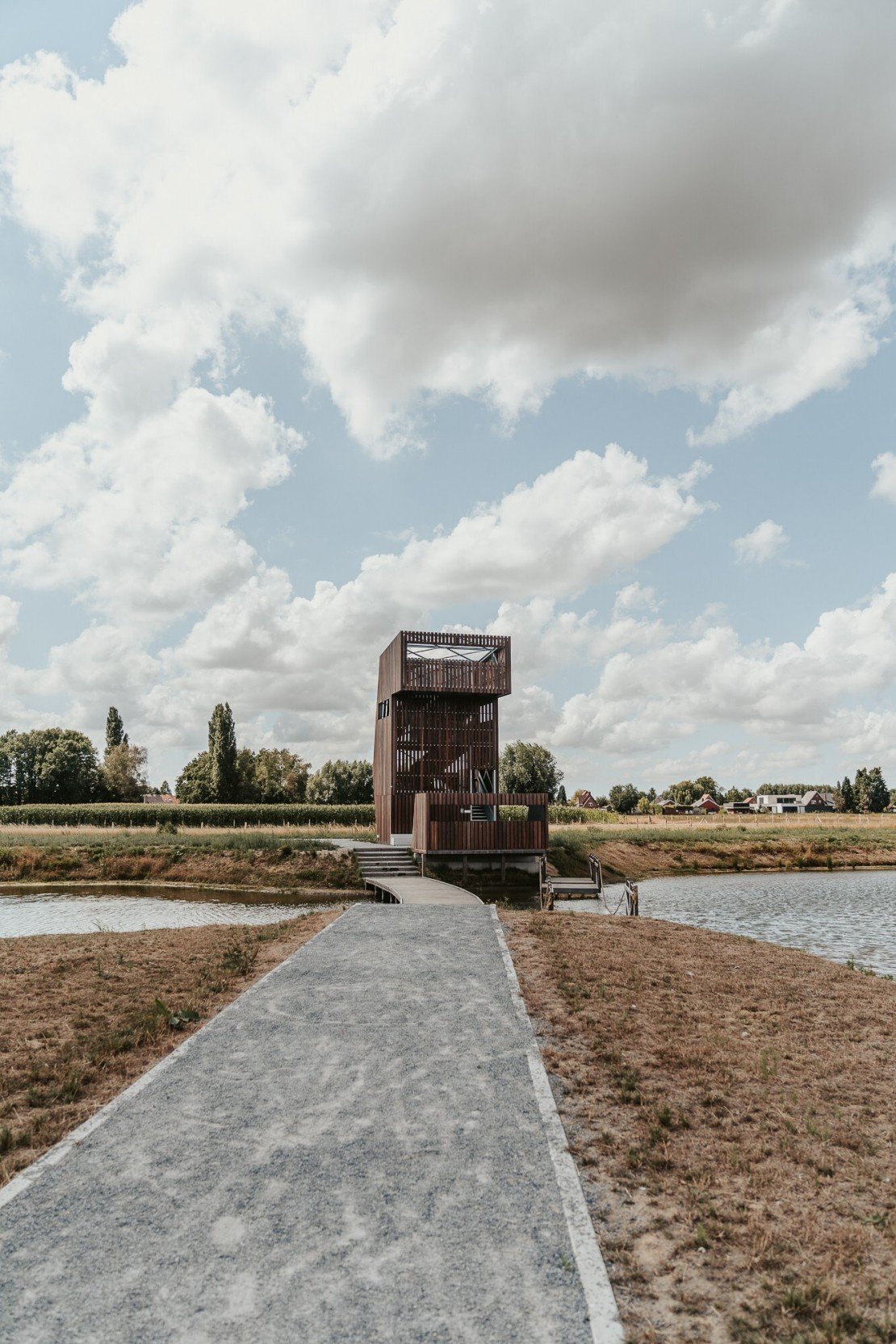 Deze prachtige uitkijktoren bevindt zich in het nieuwe landschapspark 't Hoge Water in Torhout. Abicon stond in voor de stabiliteitsstudie van de staalstructuur en de fundering.